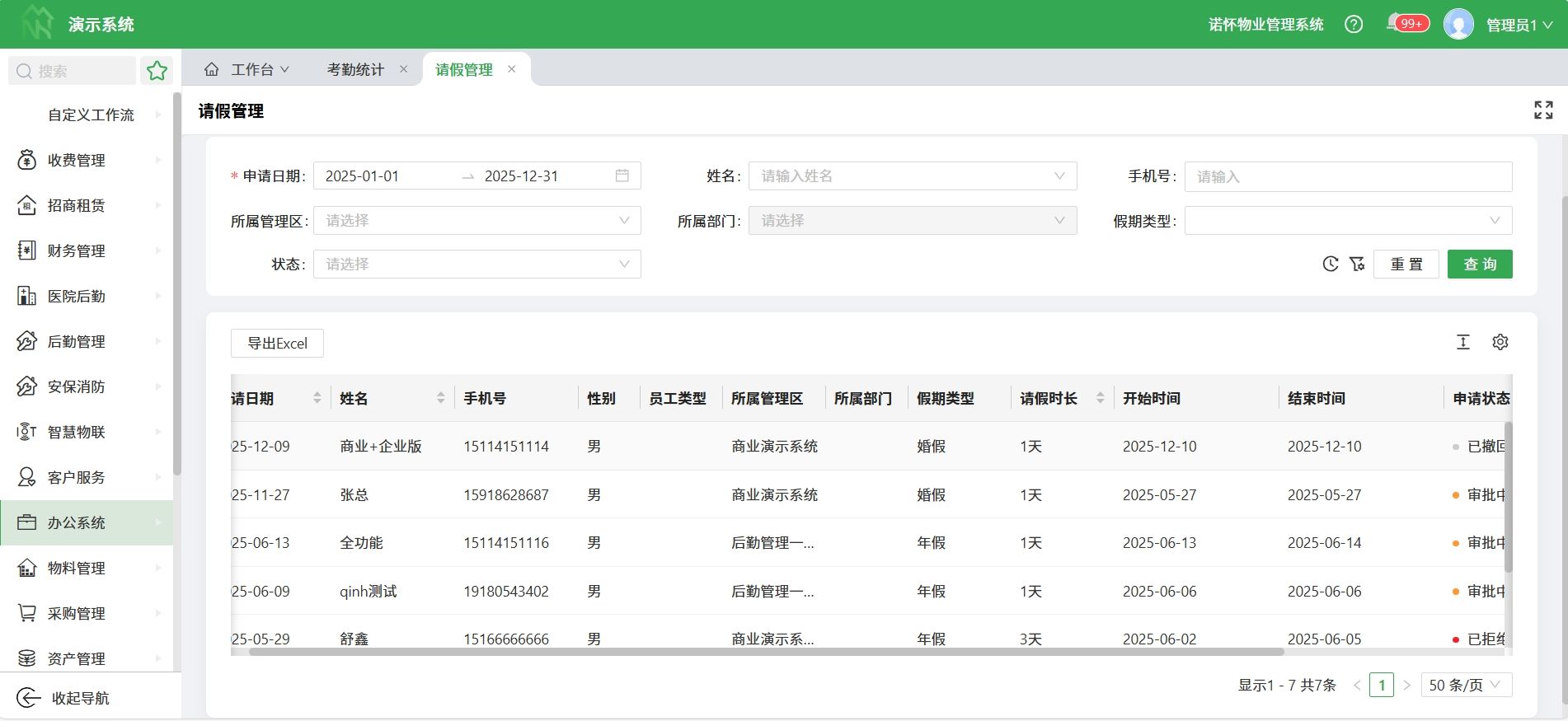 包括请假、出差、加班、迟到、早退、旷工等信息,全面掌握员工考勤状况